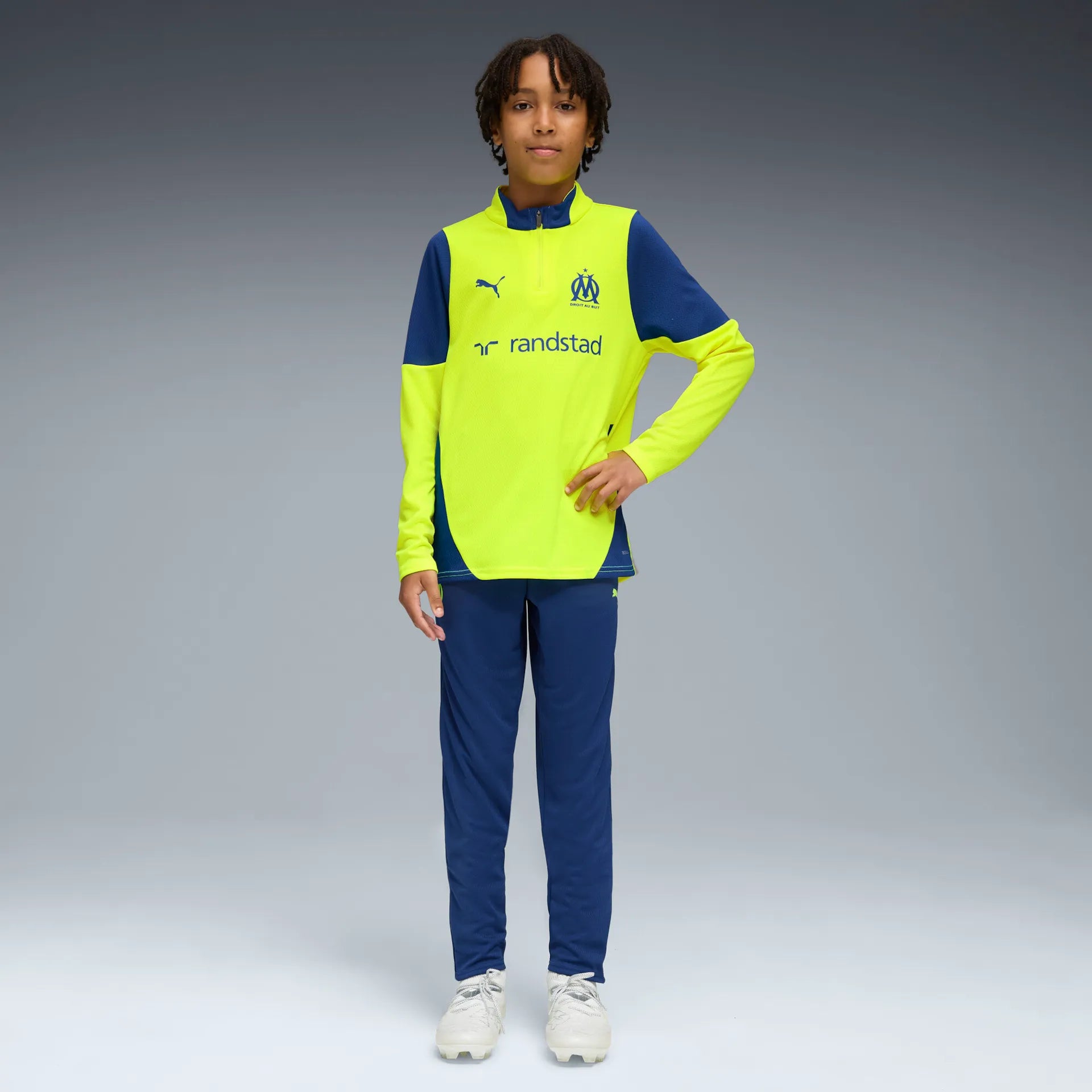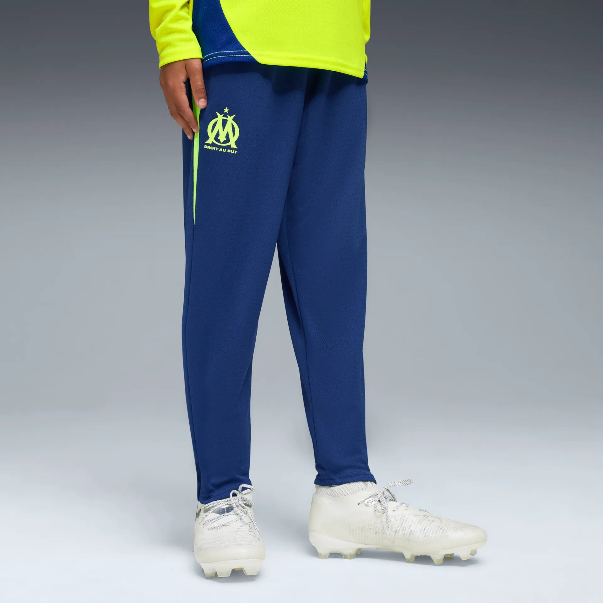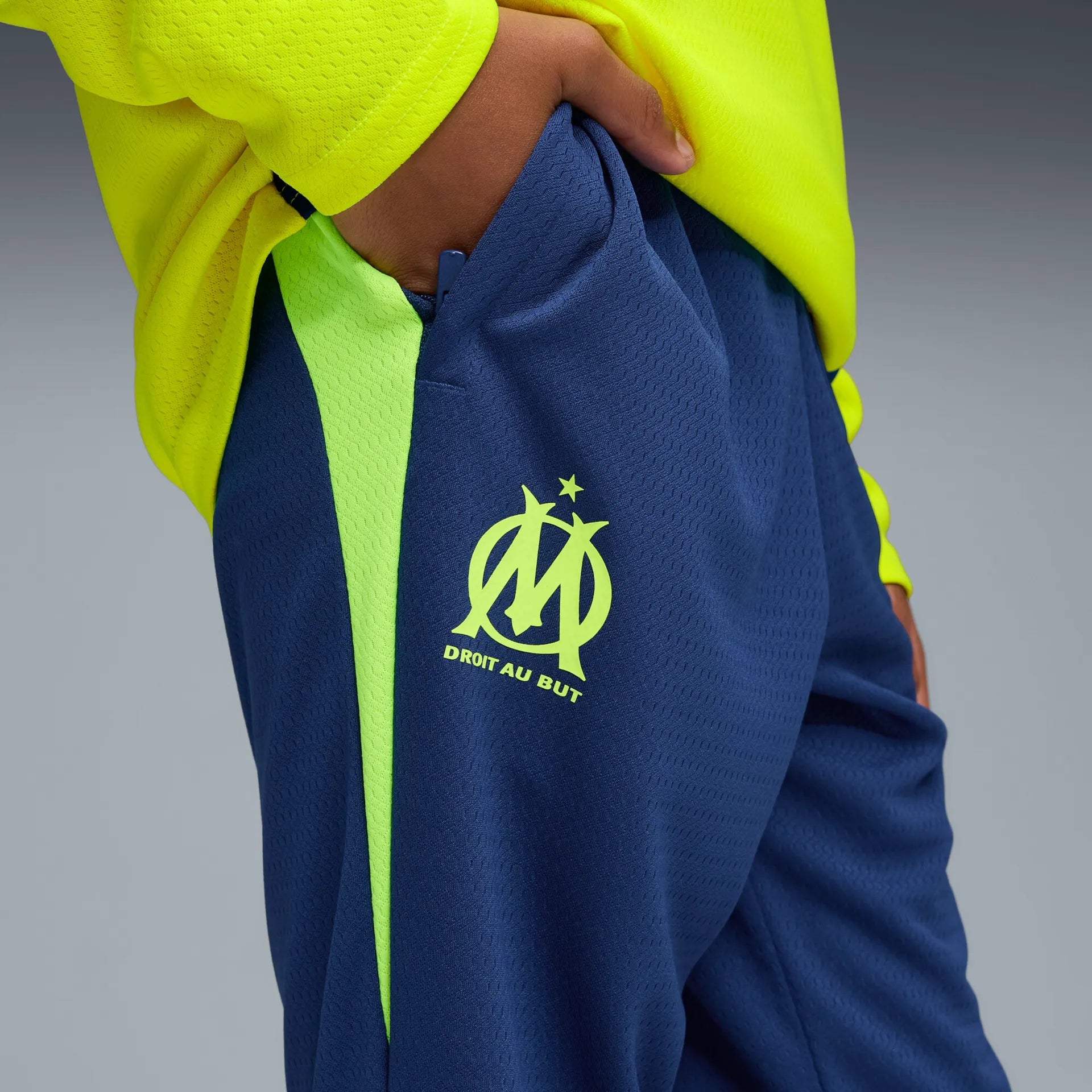 La coupe regular s’adapte facilement, tandis que la ceinture élastique assure un maintien optimal. Le logo officiel de l’OM et le félin Puma complètent l’ensemble, affirmant une identité club forte et élégante.