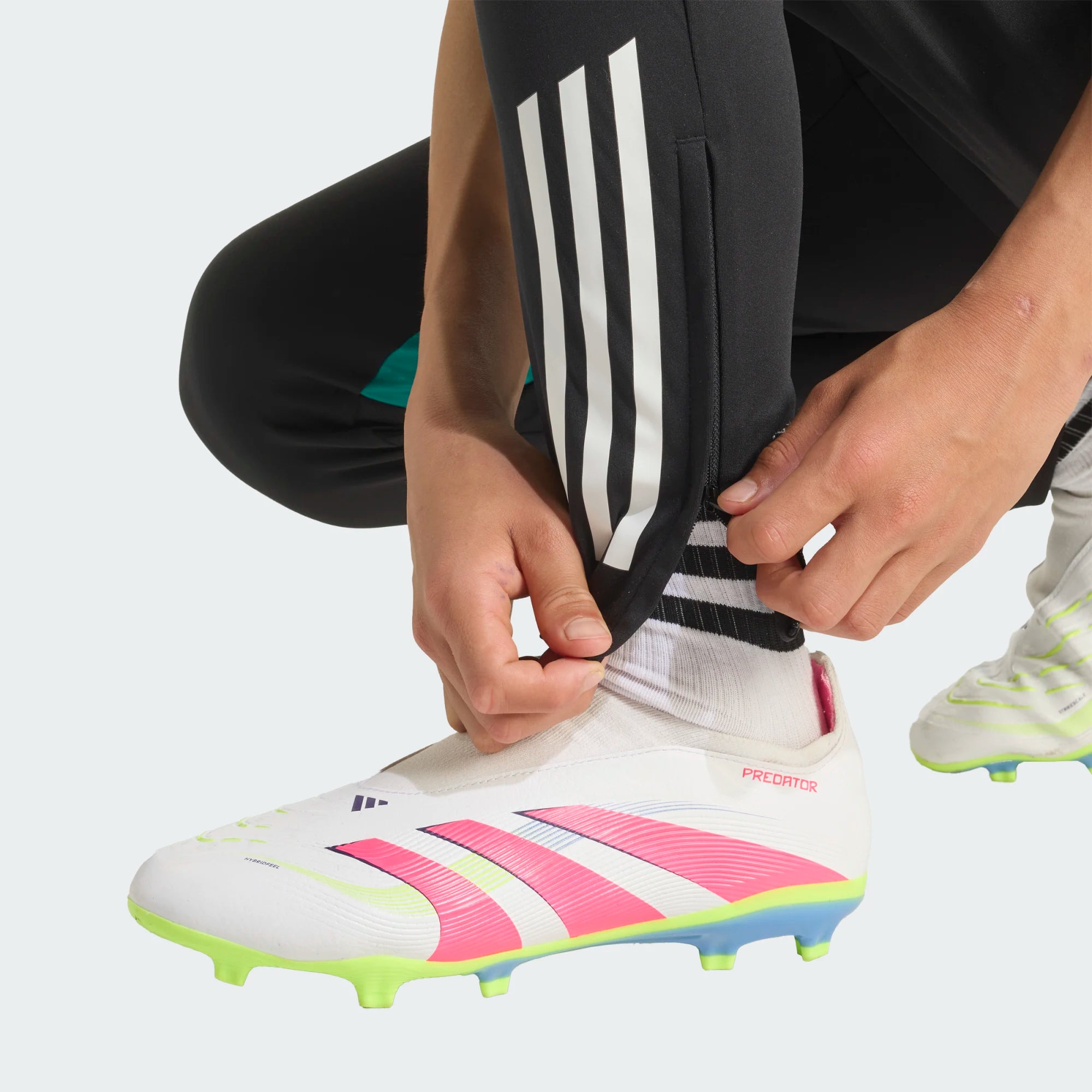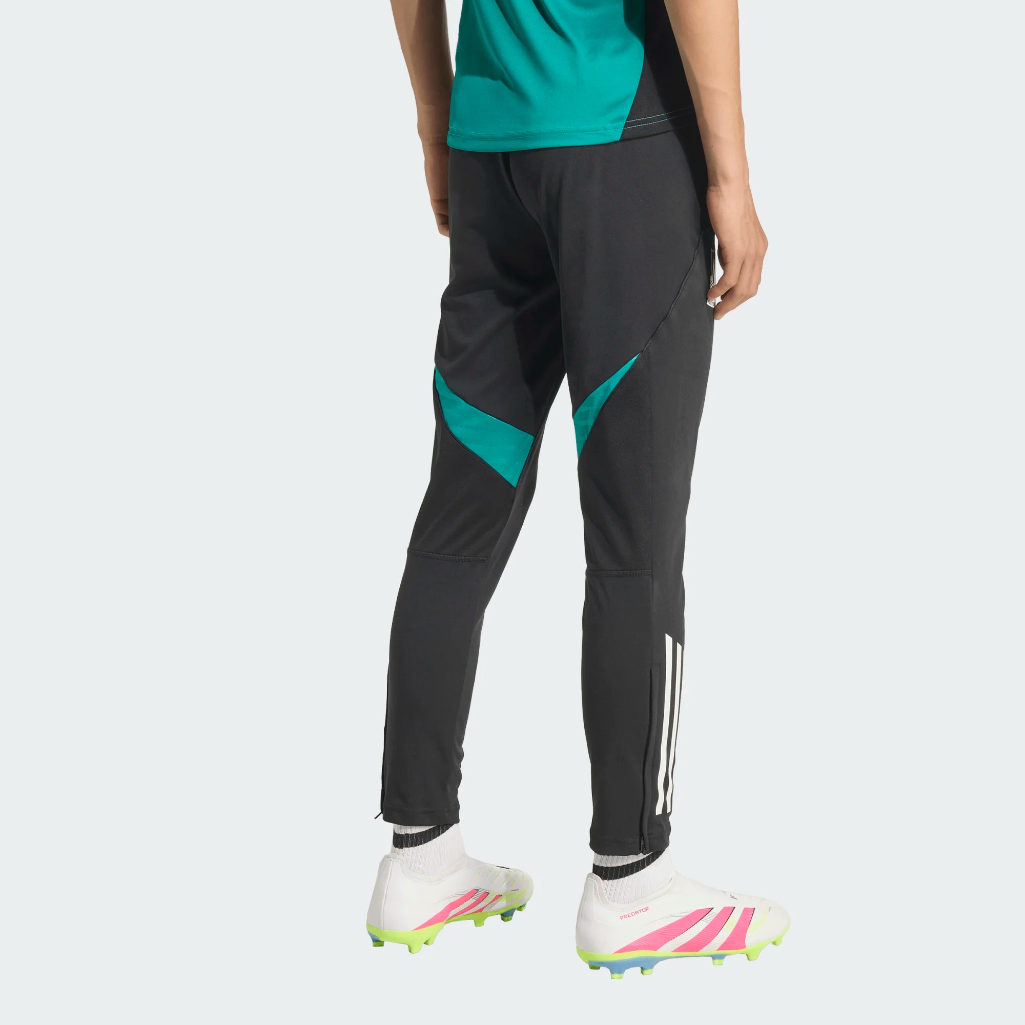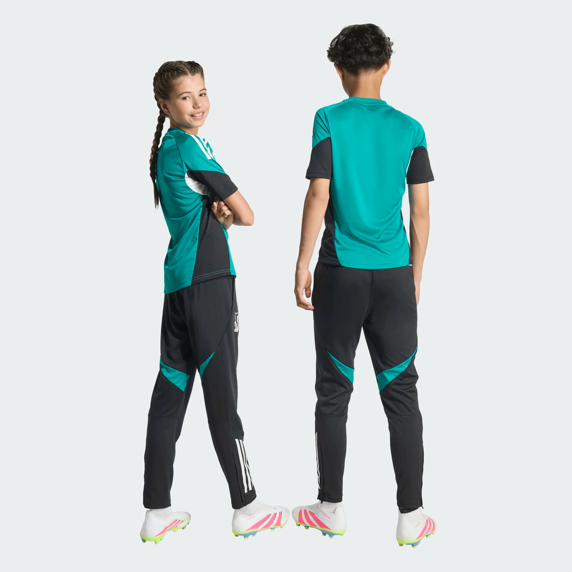 These Liverpool FC 25/26 kids' training pants feature a sleek black colorway with mint green accents from the Tiro 25/26 collection. The slim, tapered fit offers a modern, dynamic fit, while the elasticated drawstring waistband ensures a secure fit. Ankle zips make them easy to pull on over boots, and side zip pockets ensure practicality and security.