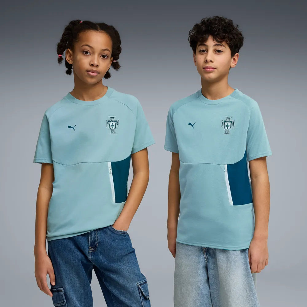 Le design se pare d'un bleu élégant, mettant en valeur le blason officiel du Portugal et le logo Puma Cat de manière subtile mais affirmée. Ce contraste de couleurs et de matières reflète l'expertise de Puma dans la création d'équipements sportswear haut de gamme pour la nouvelle génération. C'est un vêtement polyvalent qui s'associe facilement avec un short ou un pantalon de survêtement pour un look de supporter complet et sophistiqué pendant toute la compétition internationale.
