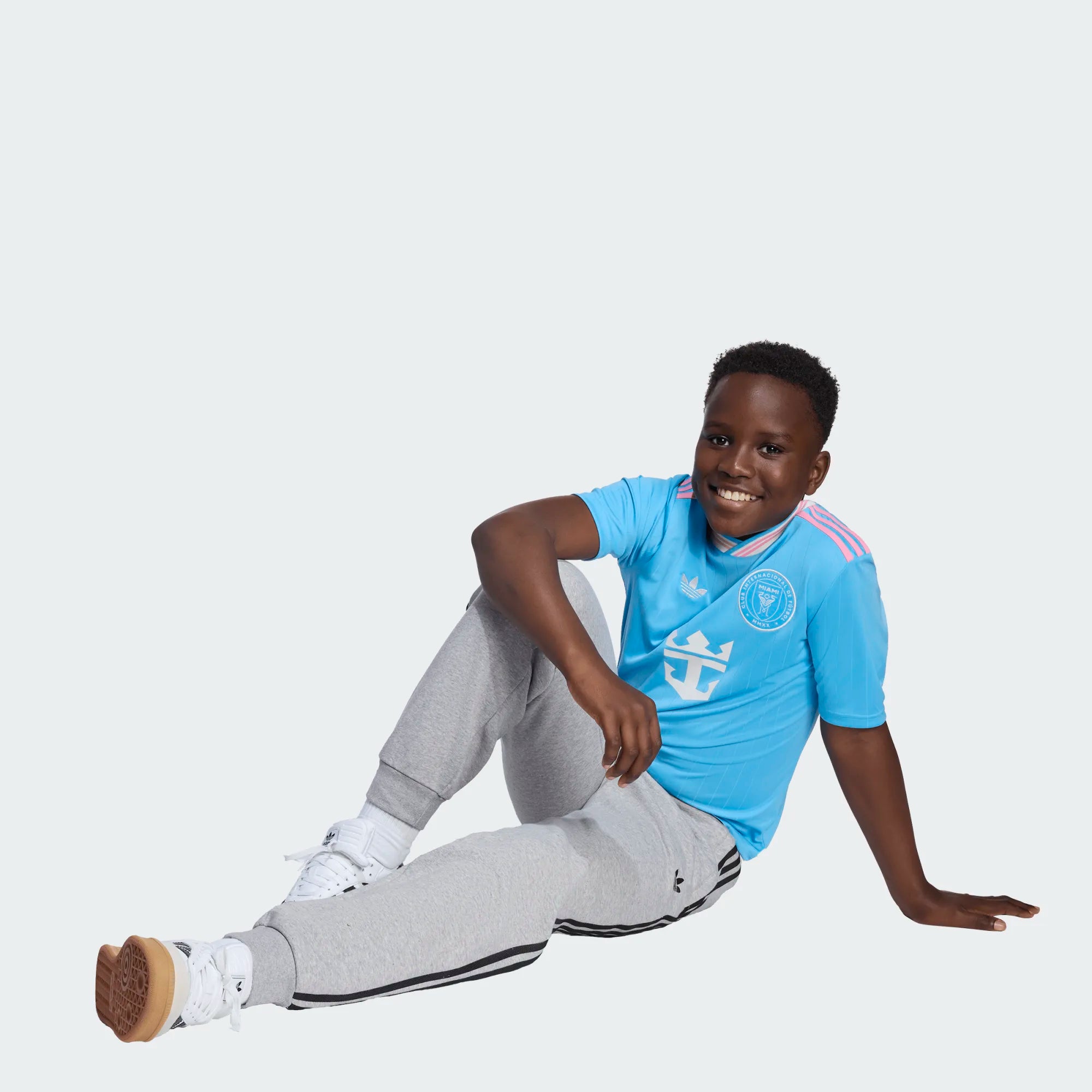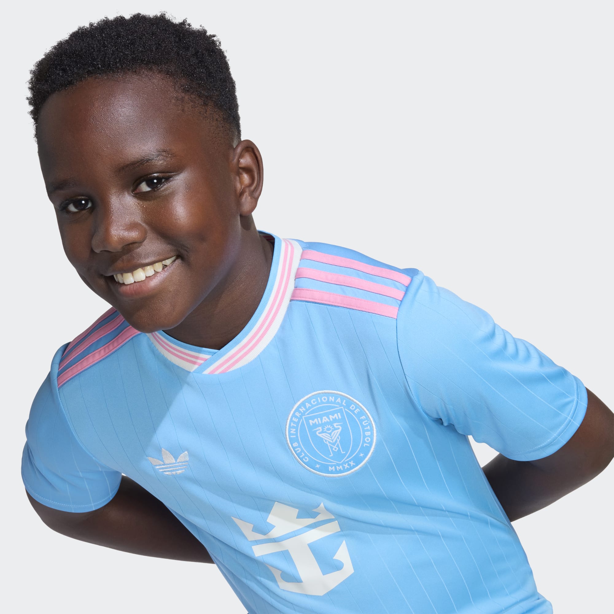 This Inter Miami CF 25/26 junior third jersey by adidas, available at PlanetFoot, is inspired by the colors of the ocean and Miami's beaches. Its ocean blue base (Semi Blue Burst) is enhanced with subtle diagonal lines that add texture and dynamism.