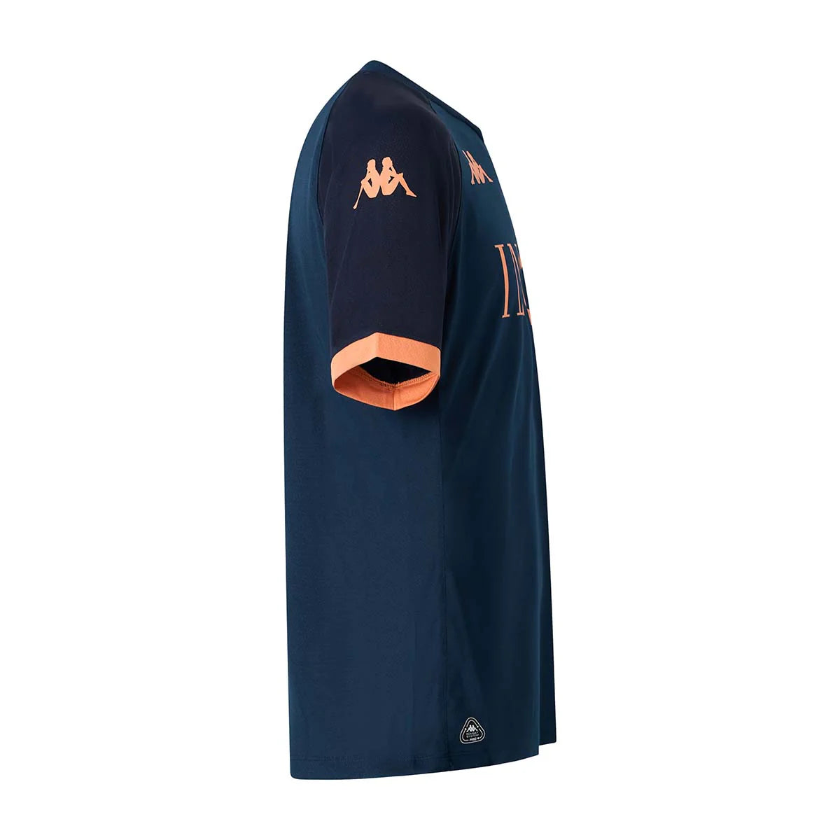 Want to train with the Gym class? The Mokiba Pro Nice 25/26 adult jersey from Kappa at PlanetFoot comes in a vibrant blue with orange accents, with the OGC Nice and Omini logos visible on the chest, sleeves, and back—a visual that proclaims club affiliation.