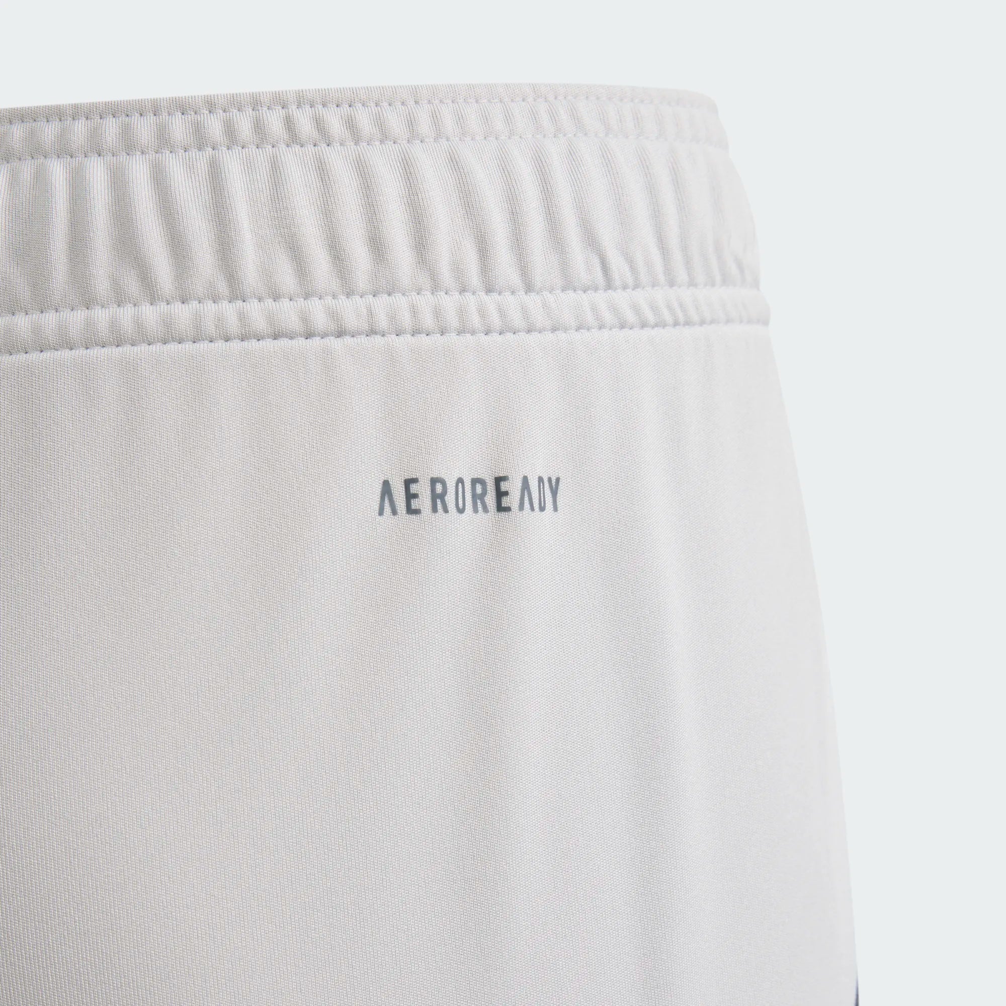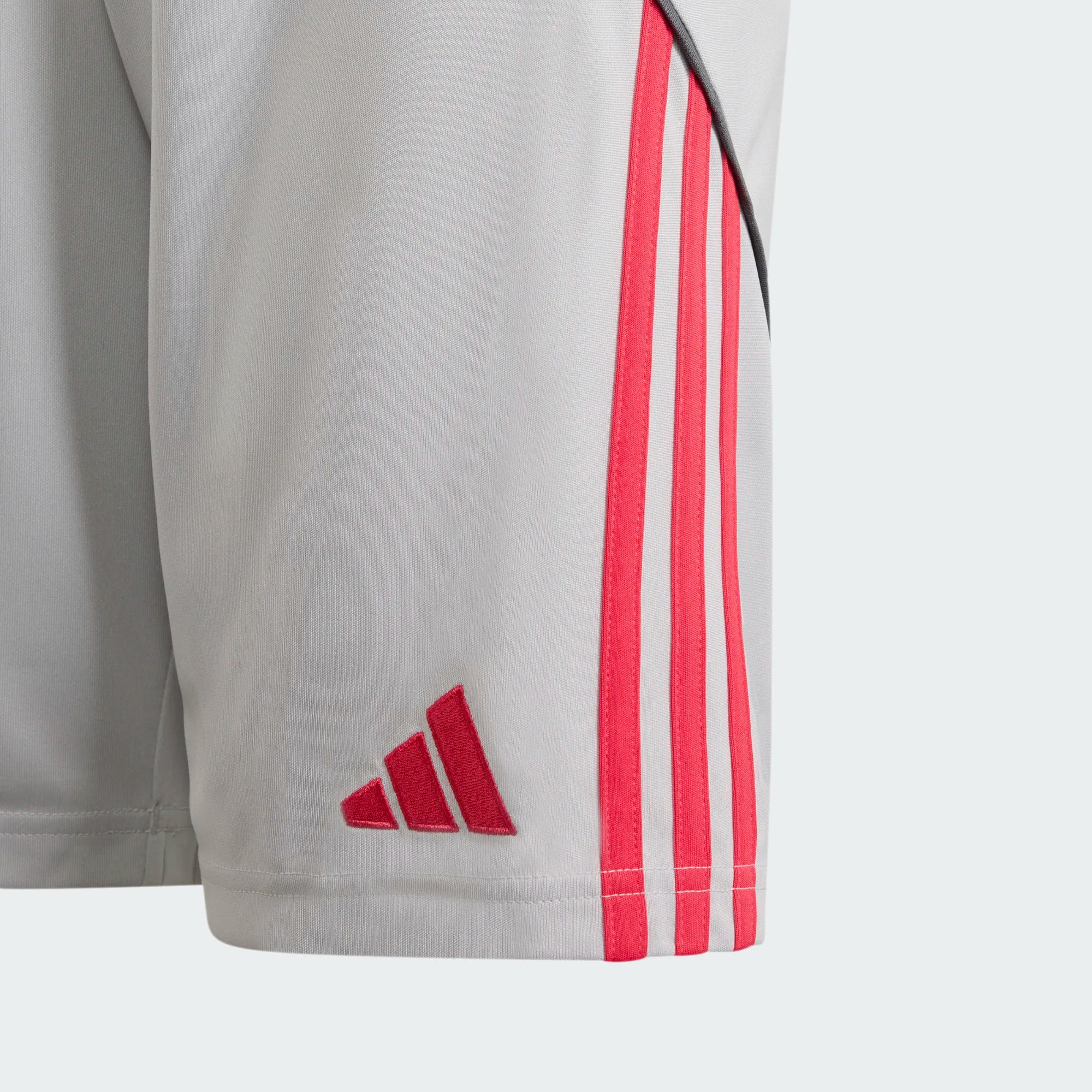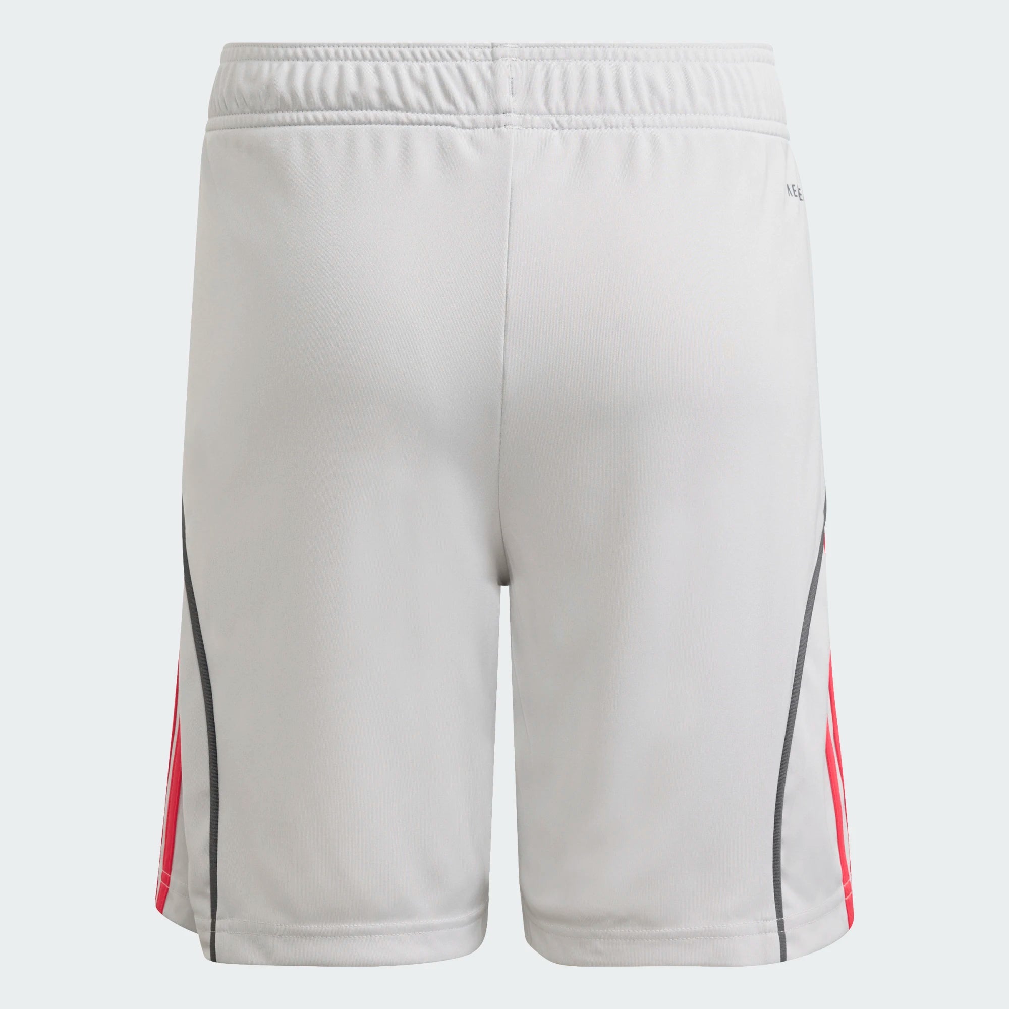 These OL 25/26 third shorts for kids complete the club's alternative kit with a stylish silver-grey colorway , paired with red and blue details reminiscent of Olympique Lyonnais' visual identity. Their regular fit and elastic waistband with adjustable drawstring guarantee optimal support and perfect comfort for playing or training. The adidas logo and embroidered OL crest underline the authenticity of the product.