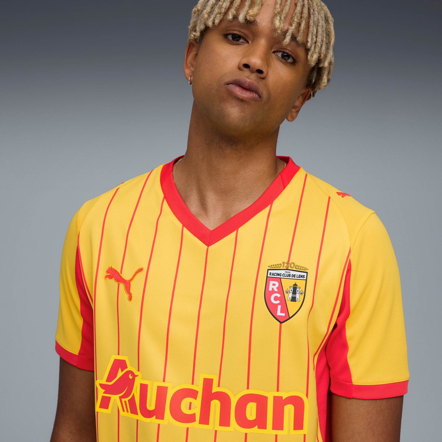 This RC Lens 25/26 home jersey by Puma, available at PlanetFoot, celebrates the club's traditional blood and gold colors. It features a vibrant yellow with thin red vertical stripes and dynamic red sleeves.