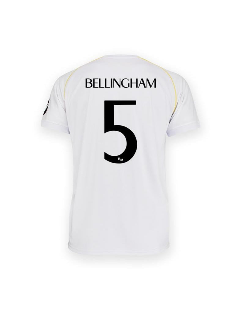 This Real Madrid 25/26 adult jersey, available from PlanetFoot, is the official club replica version featuring Jude Bellingham's number 5.