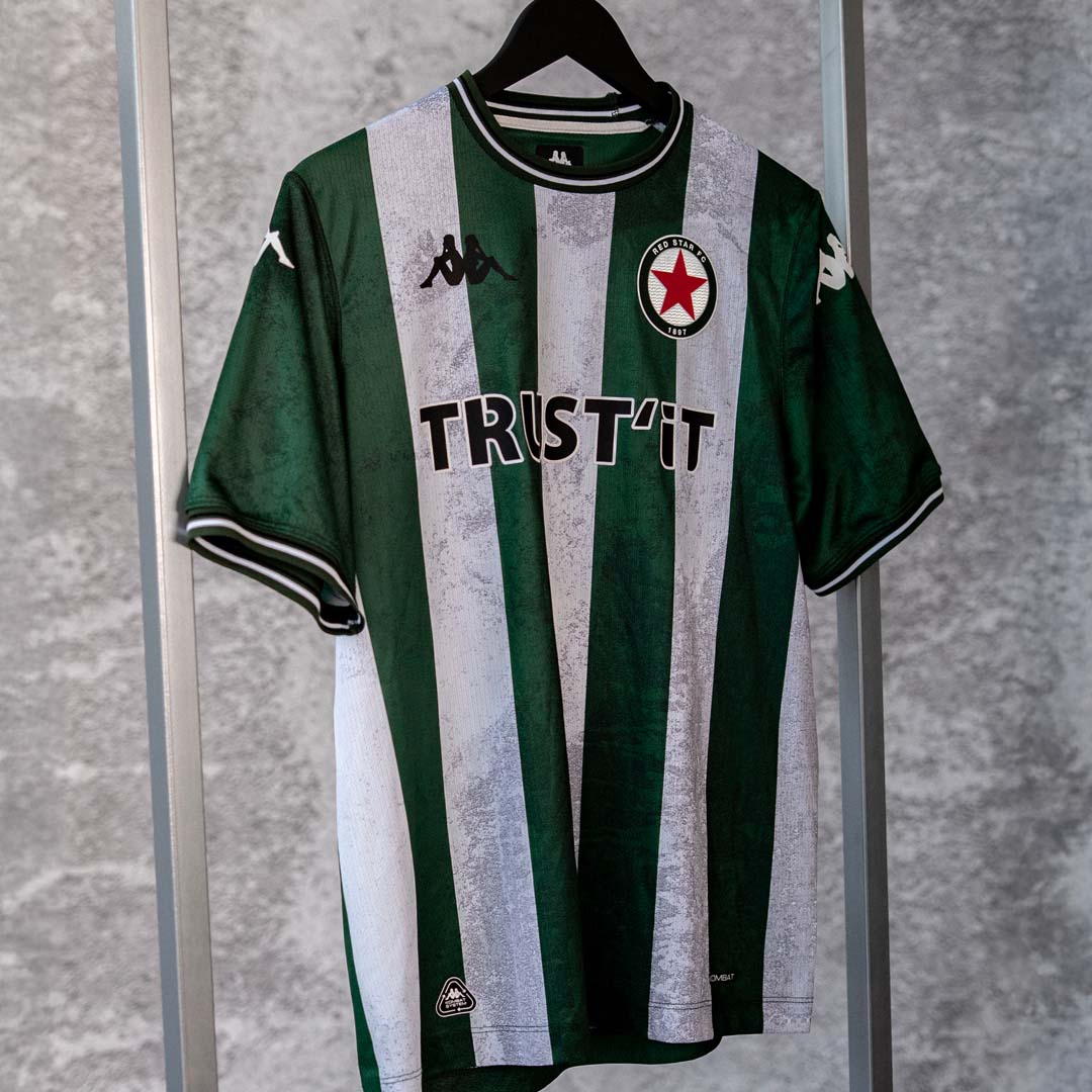 Want to rock the stands with a bold style? The Red Star 25/26 adult home jersey from Kappa at PlanetFoot features a deep green “Concrete” stripe, a design that combines the club's soul with a contemporary touch.