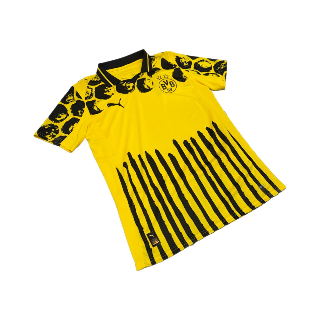 An artistic take on the Borussia Dortmund jersey, at the crossroads of fashion and football. Available now in the 2025/26 collection on PlanetFoot.