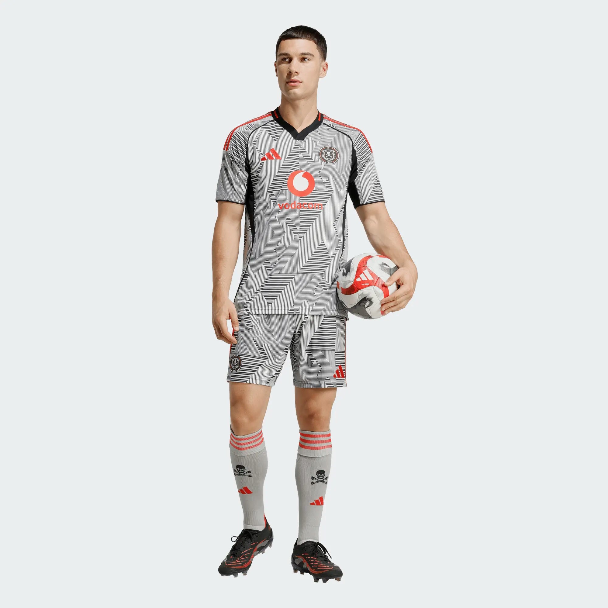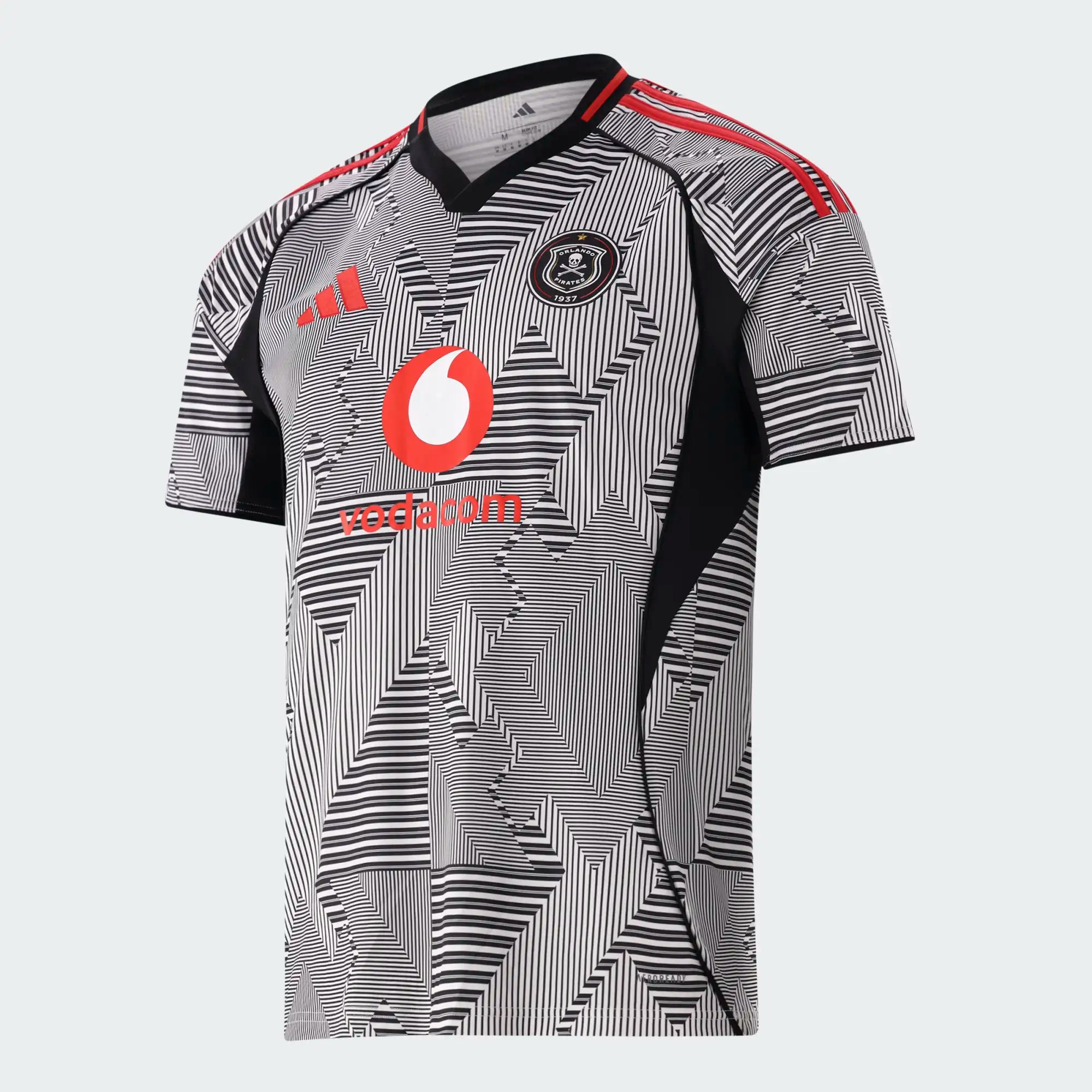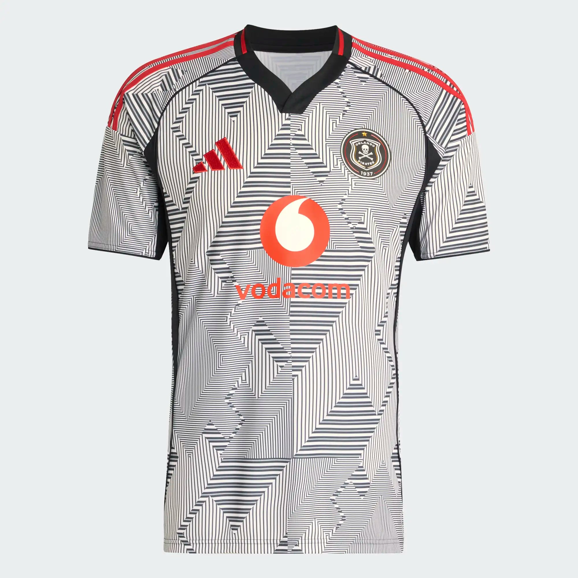 Ce maillot extérieur Orlando Pirates 25/26 pour adulte provenant de l'Afrique du Sud, signé adidas et disponible chez PlanetFoot, se distingue par un motif géométrique gris inspiré du drapeau de Johannesburg, symbole de la vitalité et de l’énergie de la ville.