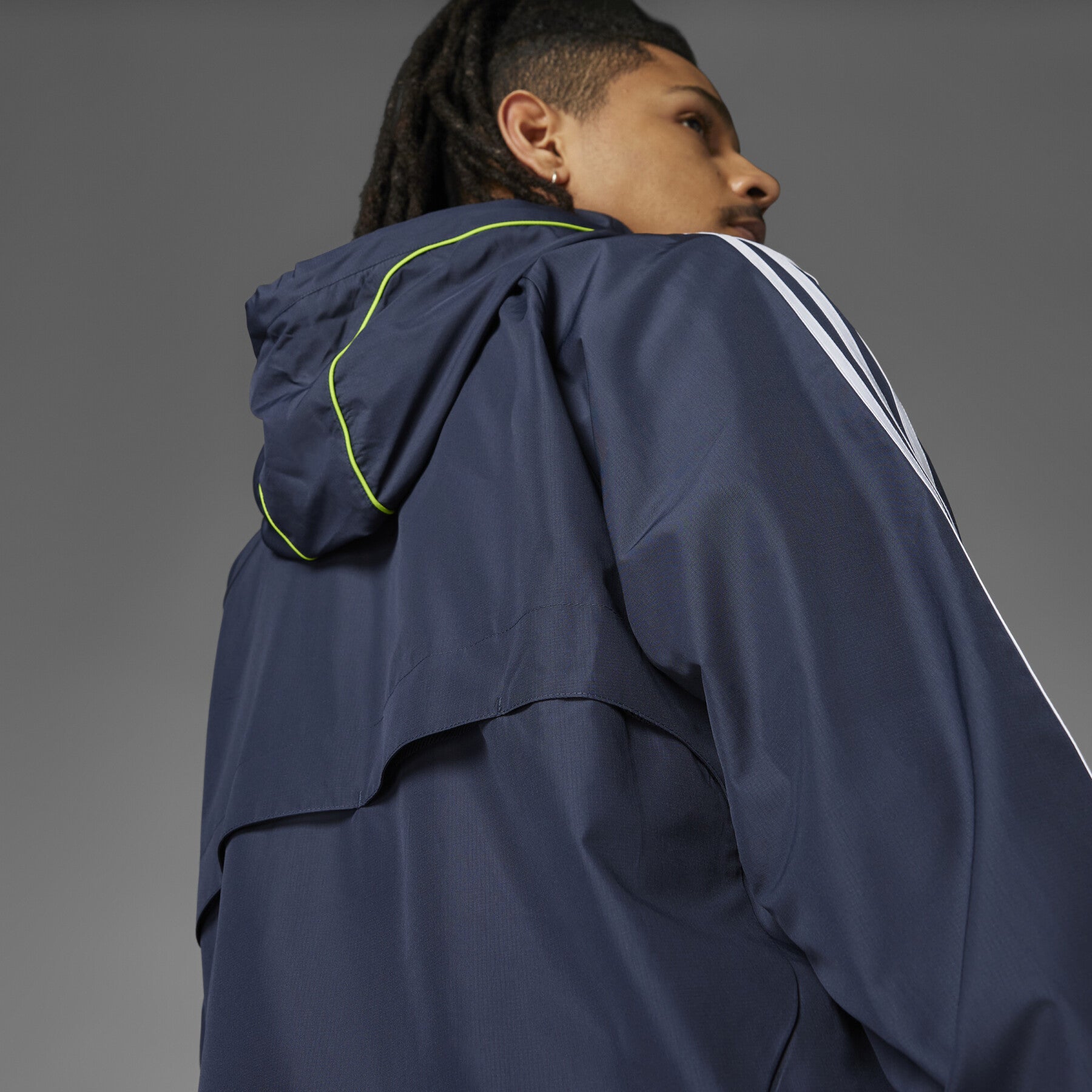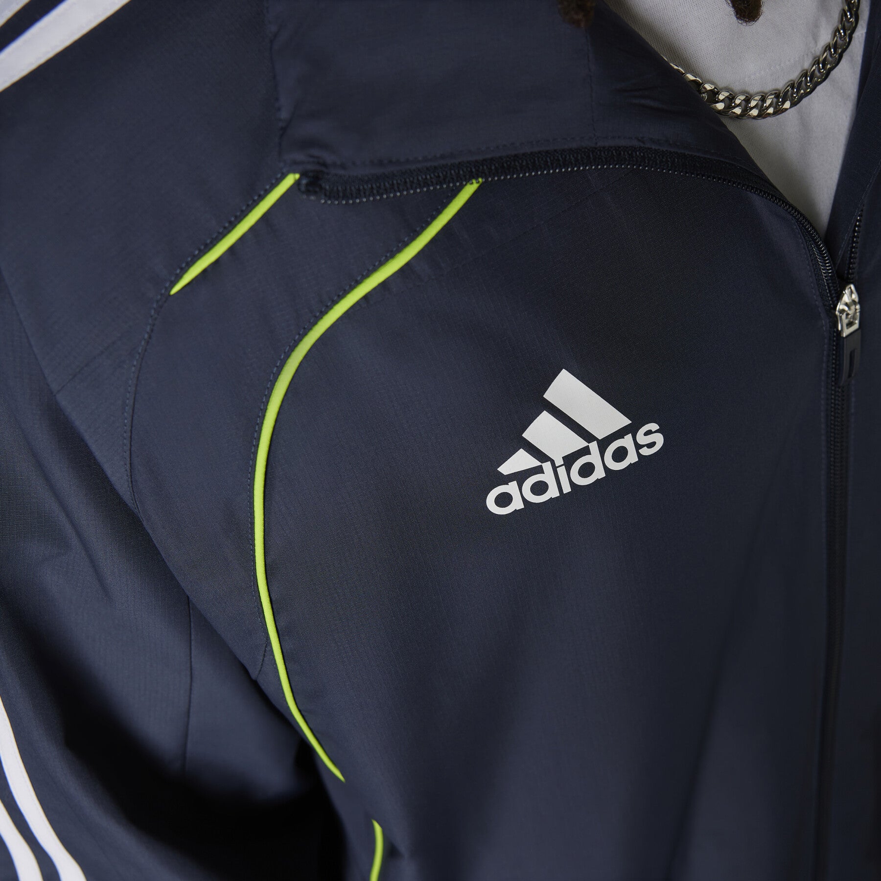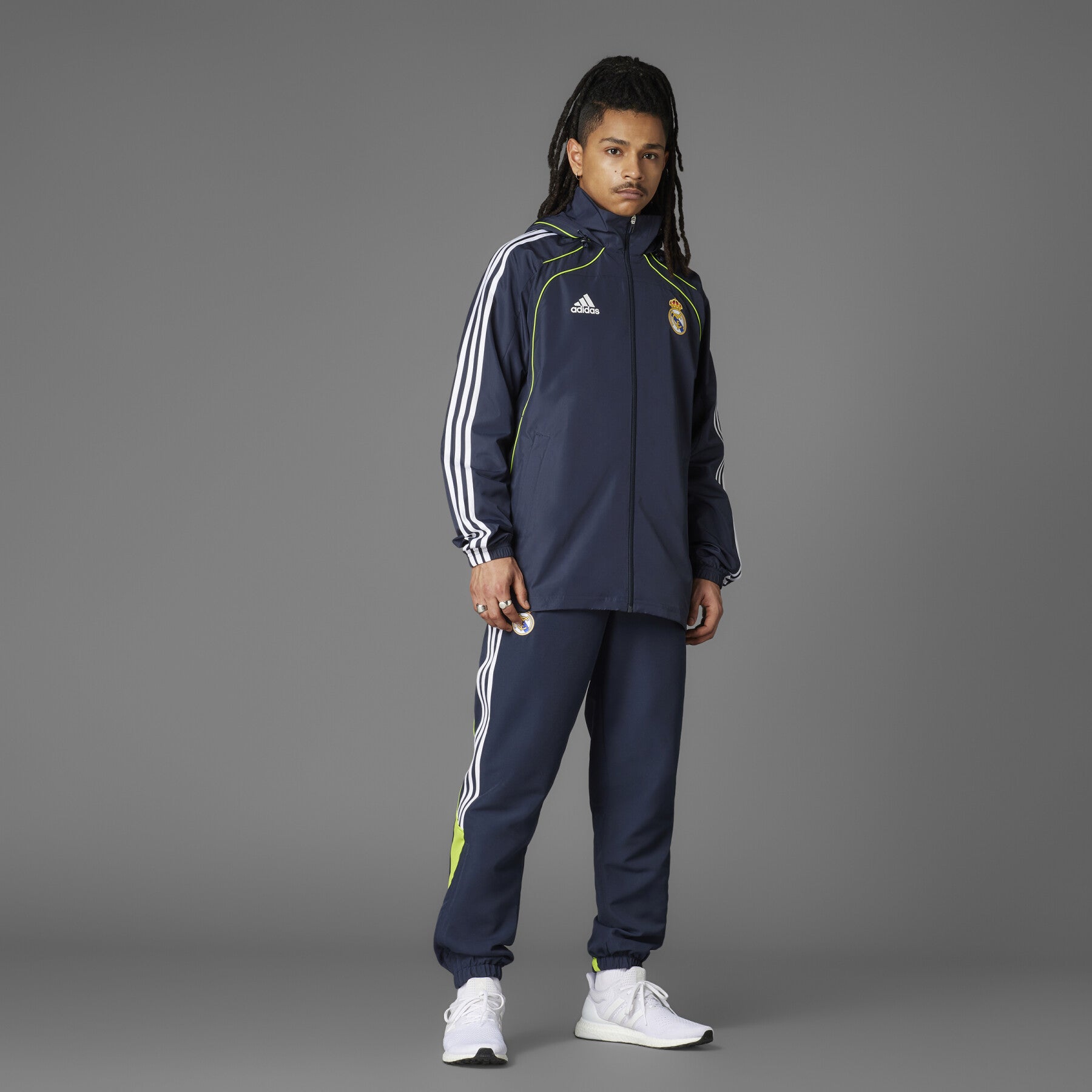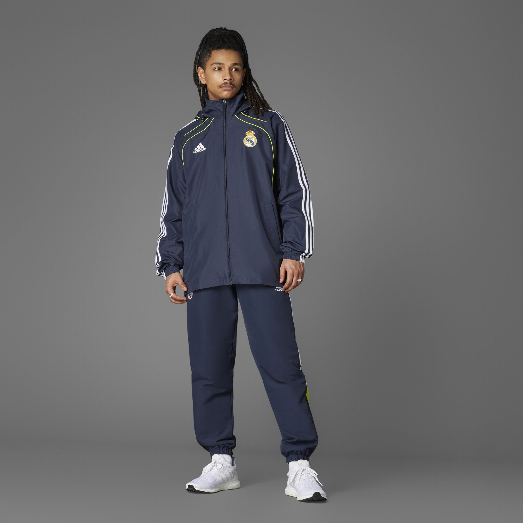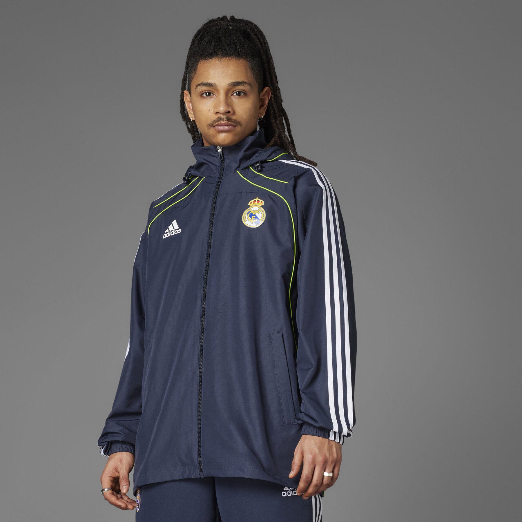 Affronte la pluie tout en affichant ton soutien aux Merengues avec la veste imperméable Real Madrid UBP 2025 bleu marine pour homme, conçue par Adidas.